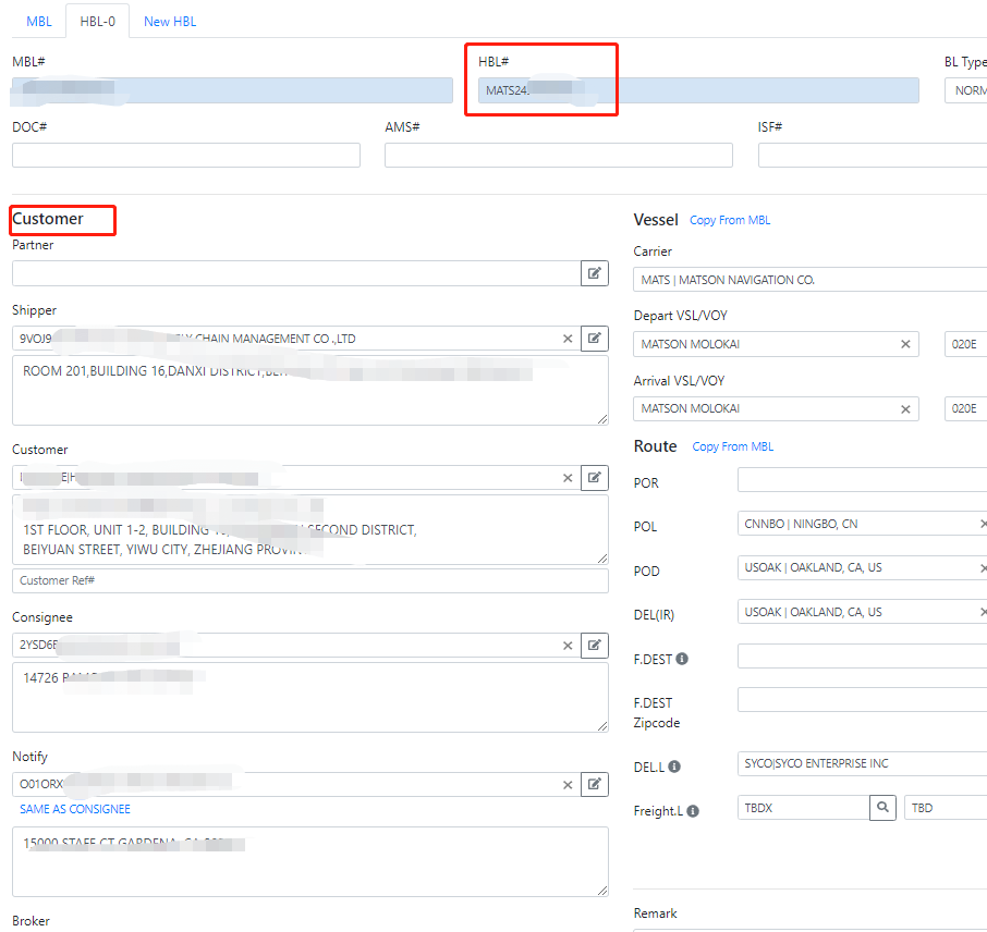 第三步,当MBL信息填写全后填写【HBL】,点击New HBL