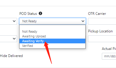 At Filter select POD Status of awating verify, then you will see the BOLs that waiting for POD verify.
