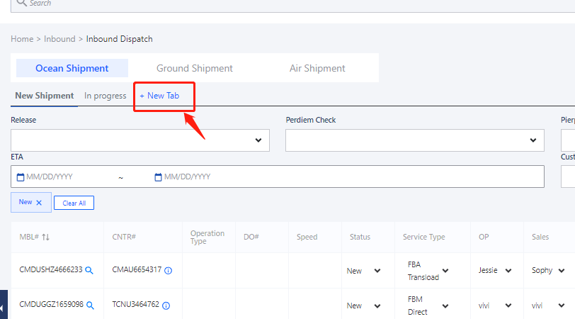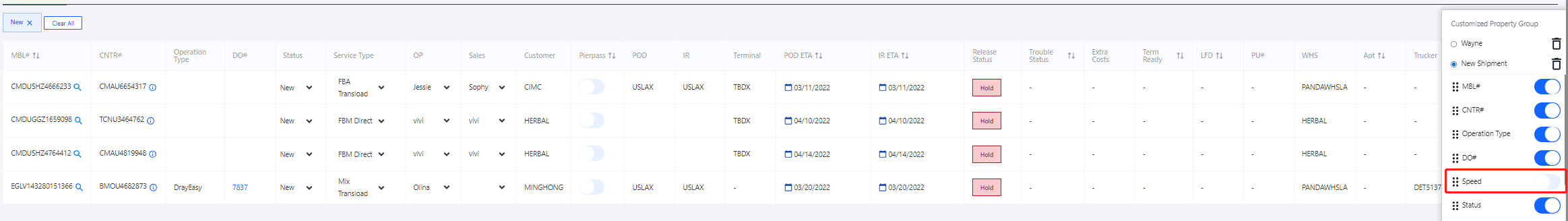 3. Check Ocean shipment detail and manage the timelines. There are 37 columns for each container, MBL - Master bill of lading # CNTR# - Container # Operation Type - Operation Type indicate it is in house DO or DE DO. DO# - DO number Speed - Speed means how soon this container was pickup, from its ready date to its pickup date. Status - Current status of this container. Service Type - what type of service is define for this container. OP - Who is the operator for this container. Sales - Who is the sales for this conatiner. Customer - customer Pierpass - for LA port, if the pierpass paid or not. POD - port of discharge. IR - Intermodal region, it can be same with POD if it is a port shipment. Terminal - terminal of the container need to be pickup. Showing as firm code. POD ETA - port of discharge ETA IR ETA - IR ETA Release Status - if this conatiner was released or not. Trouble Status - if there is any trouble need to mark. Extra Costs - if any extra cost happened. need to be record. Term Ready - Terminal ready date. LFD - Last Free Day PU# - PU# WHS - Delivery to warehouse. Apt - Apt time with terminal. Out Gate - Outgate date. SKD - Schedule delivery date to warehouse. DEL - actual delviery date to warehouse. Empty - empty date Notify - nofify trucker empty date Return - Empty returned date. Chassis - Chassis usage system calculate Perdiem Check - Checked peridme or not Trucker - trucker name. Remark - any remark for this container Act - accounting. DOC - documents related to this container. LOG - history log.